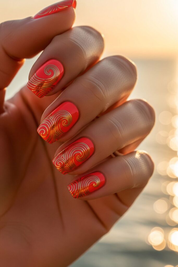 This design features bold coral polish with delicate gold wave lines, inspired by the shimmering ocean at sunset. I love it because it’s elegant and vibrant, making it one of the most striking End of summer nails designs. The gold accents give it a luxurious touch, while the coral base keeps it fresh and fun.
