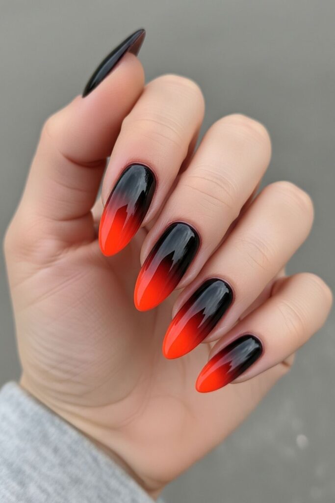 A Halloween classic—orange fading into black. I love how chic yet simple this ombre design looks. It’s perfect for trendy Halloween nails when you want something stylish without heavy details. Works beautifully for almond Halloween nails, giving them a sleek and polished finish.