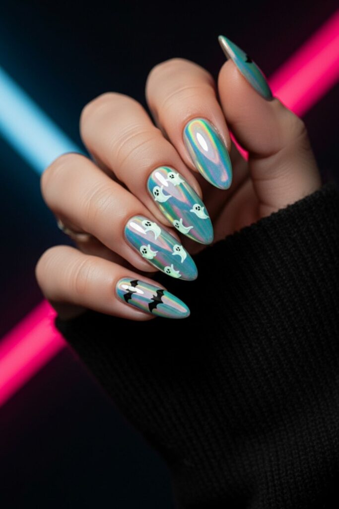 Holographic polish with spooky accents like ghosts or bats creates a futuristic twist. I love how this design feels trendy and unique for Halloween 2025. It’s great for cute Halloween nails with a modern vibe. Perfect for almond or square nails to really showcase the shimmer.