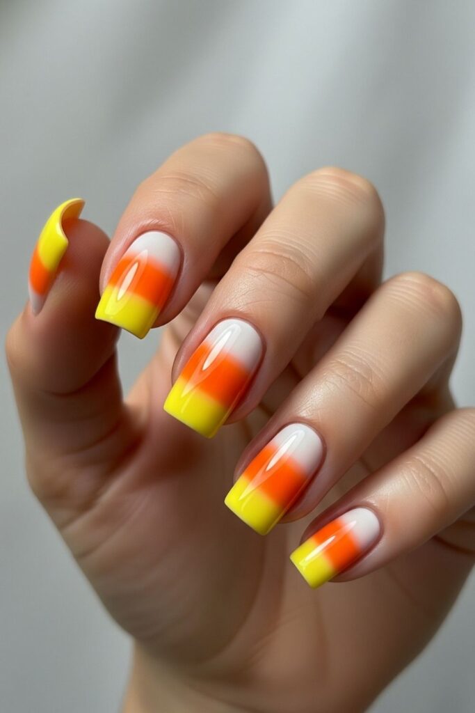 Bright, cheerful, and classic—candy corn nails are always a Halloween hit. I like how these cute Halloween nails mix playful colors without being too complicated. They’re super easy Halloween nails for beginners and look adorable on both short and square styles. Perfect for a sweet festive look.